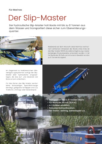 Der hydraulische SlipMaster holt Boote mit bis zu 8 Tonnen aus Mit unseren Spezialanhängern eröffnen sich vielfältige Möglichkeiten für Ihre